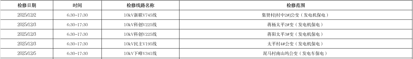 根据国网杭州市临安区供电公司生产计划检修安排,定于12月1日-12月5日进行电力设备检修,现将电力设备检修影响客户区域范围列表公告如下,若遇雨天、雷暴等恶劣天气检修工作取消,工作期间会对正常供电造成影响,请各相关用户谅解并做好生产安排,如有疑问,请咨询电力服务电话:51234567!