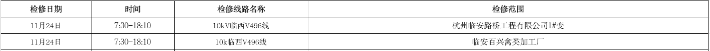 根据国网杭州市临安区供电公司生产计划检修安排,定于11月24日进行电力设备检修,现将电力设备检修影响客户区域范围列表公告如下,若遇雨天、雷暴等恶劣天气检修工作取消,工作期间会对正常供电造成影响,请各相关用户谅解并做好生产安排,如有疑问,请咨询电力服务电话:51234567!