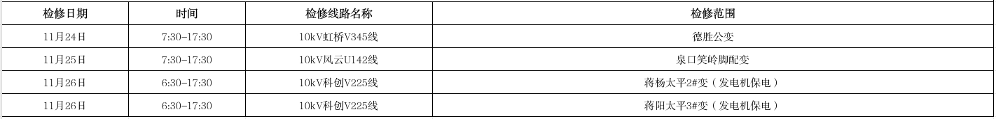 根据国网杭州市临安区供电公司生产计划检修安排,定于11月24日-11月30日进行电力设备检修,现将电力设备检修影响客户区域范围列表公告如下,若遇雨天、雷暴等恶劣天气检修工作取消,工作期间会对正常供电造成影响,请各相关用户谅解并做好生产安排,如有疑问,请咨询电力服务电话:51234567!