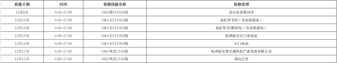 根据国网杭州市临安区供电公司生产计划检修安排,定于12月9日-12月11日进行电力设备检修,现将电力设备检修影响客户区域范围列表公告如下,若遇雨天、雷暴等恶劣天气检修工作取消,工作期间会对正常供电造成影响,请各相关用户谅解并做好生产安排,如有疑问,请咨询电力服务电话:51234567!