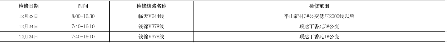 根据国网杭州市临安区供电公司生产计划检修安排,定于12月22日-12月24日进行电力设备检修,现将电力设备检修影响客户区域范围列表公告如下,若遇雨天、雷暴等恶劣天气检修工作取消,工作期间会对正常供电造成影响,请各相关用户谅解并做好生产安排,如有疑问,请咨询电力服务电话:51234567!