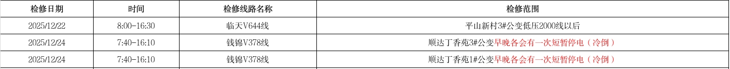 根据国网杭州市临安区供电公司生产计划检修安排,定于12月22日-12月26日进行电力设备检修,现将电力设备检修影响客户区域范围列表公告如下,若遇雨天、雷暴等恶劣天气检修工作取消,工作期间会对正常供电造成影响,请各相关用户谅解并做好生产安排,如有疑问,请咨询电力服务电话:51234567!