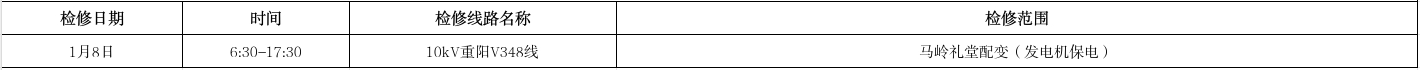 根据国网杭州市临安区供电公司生产计划检修安排,定于1月5日-1月11日进行电力设备检修,现将电力设备检修影响客户区域范围列表公告如下,若遇雨天、雷暴等恶劣天气检修工作取消,工作期间会对正常供电造成影响,请各相关用户谅解并做好生产安排,如有疑问,请咨询电力服务电话:51234567!
