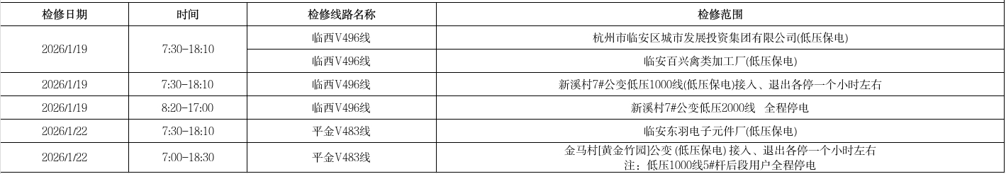 根据国网杭州市临安区供电公司生产计划检修安排,定于1月19日-1月25日进行电力设备检修,现将电力设备检修影响客户区域范围列表公告如下,若遇雨天、雷暴等恶劣天气检修工作取消,工作期间会对正常供电造成影响,请各相关用户谅解并做好生产安排,如有疑问,请咨询电力服务电话:51234567!
