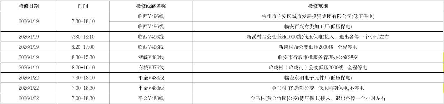 根据国网杭州市临安区供电公司生产计划检修安排,定于1月19日-1月22日进行电力设备检修,现将电力设备检修影响客户区域范围列表公告如下,若遇雨天、雷暴等恶劣天气检修工作取消,工作期间会对正常供电造成影响,请各相关用户谅解并做好生产安排,如有疑问,请咨询电力服务电话:51234567!
