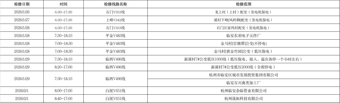 根据国网杭州市临安区供电公司生产计划检修安排,定于1月26日-2月1日进行电力设备检修,现将电力设备检修影响客户区域范围列表公告如下,若遇雨天、雷暴等恶劣天气检修工作取消,工作期间会对正常供电造成影响,请各相关用户谅解并做好生产安排,如有疑问,请咨询电力服务电话:51234567!