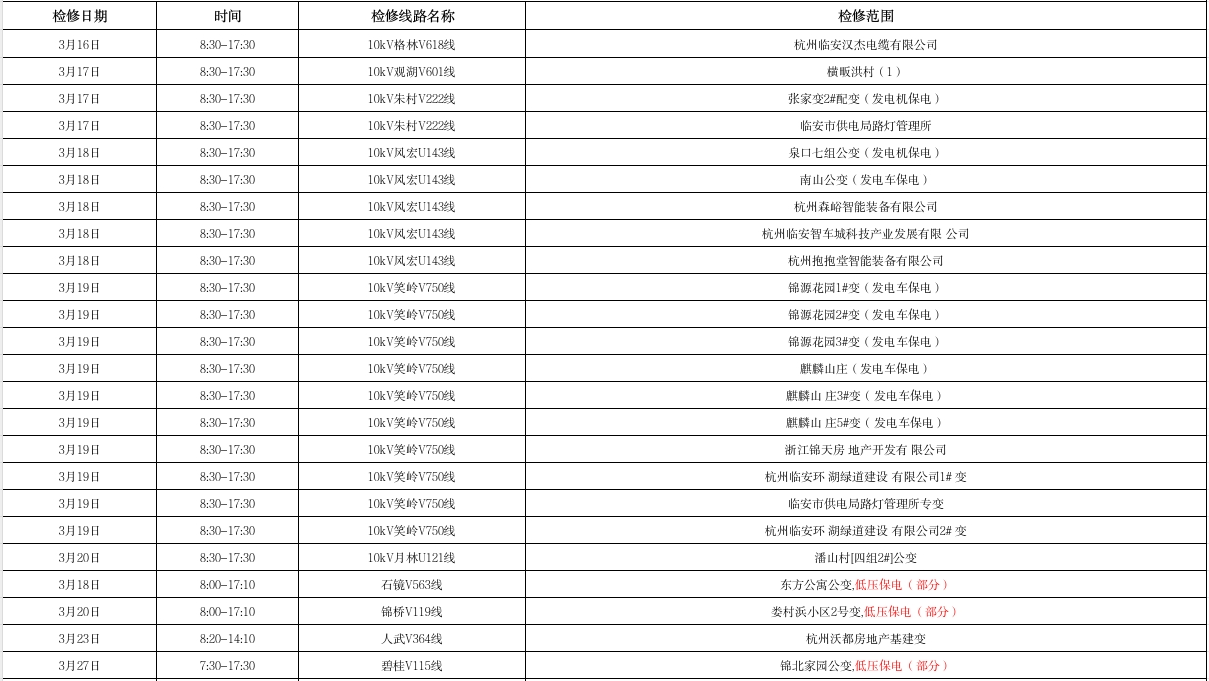 根据国网杭州市临安区供电公司生产计划检修安排,定于3月16日-3月27日进行电力设备检修,现将电力设备检修影响客户区域范围列表公告如下,若遇雨天、雷暴等恶劣天气检修工作取消,工作期间会对正常供电造成影响,请各相关用户谅解并做好生产安排,如有疑问,请咨询电力服务电话:51234567!
