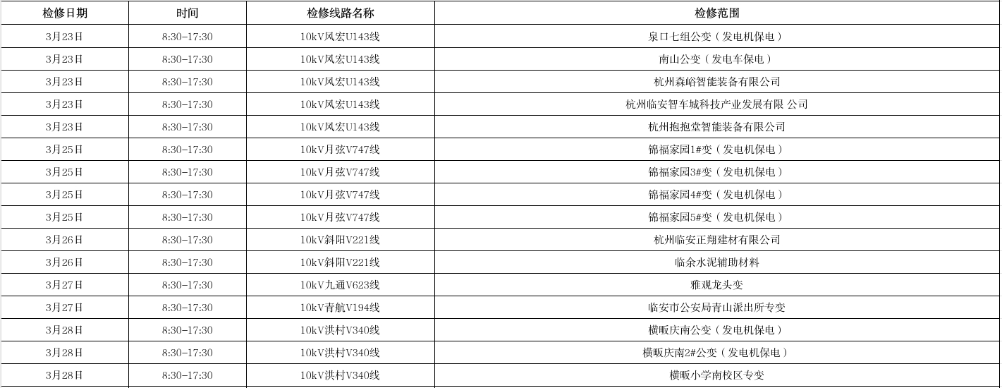 根据国网杭州市临安区供电公司生产计划检修安排,定于3月23日-3月29日进行电力设备检修,现将电力设备检修影响客户区域范围列表公告如下,若遇雨天、雷暴等恶劣天气检修工作取消,工作期间会对正常供电造成影响,请各相关用户谅解并做好生产安排,如有疑问,请咨询电力服务电话:51234567!