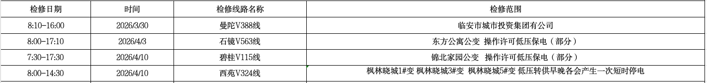 根据国网杭州市临安区供电公司生产计划检修安排,定于3月30日-4月12日进行电力设备检修,现将电力设备检修影响客户区域范围列表公告如下,若遇雨天、雷暴等恶劣天气检修工作取消,工作期间会对正常供电造成影响,请各相关用户谅解并做好生产安排,如有疑问,请咨询电力服务电话:51234567!
